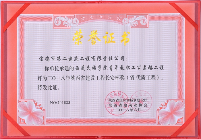 長安杯獎是陜西省住房和城鄉(xiāng)建設(shè)廳評選、頒發(fā)的本省建設(shè)工程質(zhì)量最高榮譽(yù)獎。西藏民族學(xué)院青年職工公寓樓工程是西藏民族學(xué)院(現(xiàn)更名西藏民族大學(xué))確定的重點(diǎn)建設(shè)工程項目,也是公司推行內(nèi)部模擬股份制架構(gòu)下精細(xì)化管理模式試點(diǎn)項目。在建設(shè)初期,公司總部精心策劃,全力部署,公司領(lǐng)導(dǎo)多次蒞臨施工現(xiàn)場檢查指導(dǎo)工作。公司副總經(jīng)理兼項目經(jīng)理曾永祥精心組織,細(xì)化分工,責(zé)任到人,嚴(yán)格要求項目部全體管理人員,并堅持以身作則,帶領(lǐng)整個團(tuán)隊,戰(zhàn)高溫、抗嚴(yán)寒、抓質(zhì)量、搶進(jìn)度,最終完成了這項經(jīng)得起各方檢驗的優(yōu)質(zhì)工程,為業(yè)主和社會交上了一份滿意的答卷。