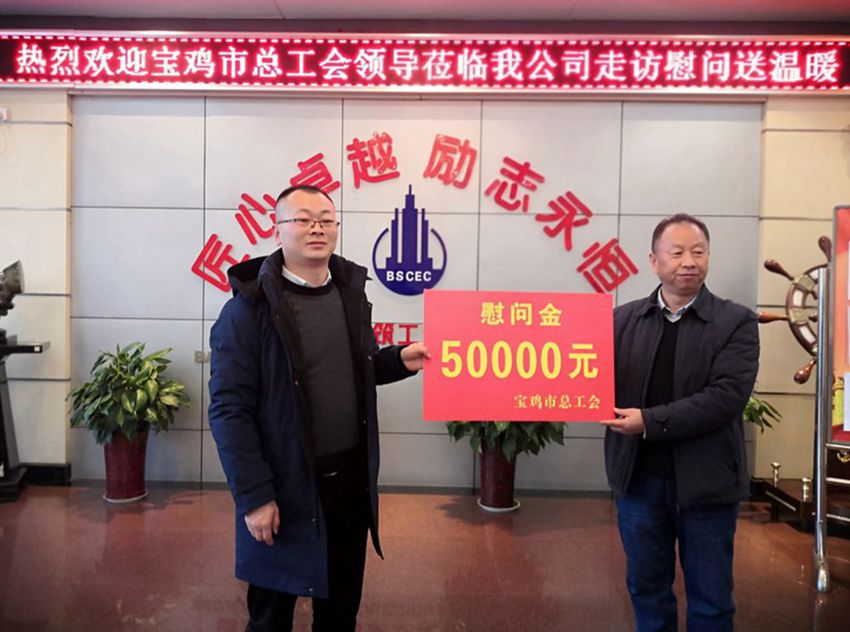 2021年1月12日下午,由寶雞市總工會(huì)黨組副書(shū)記、常務(wù)副主席趙會(huì)祥帶隊(duì)的市總工會(huì)慰問(wèn)組來(lái)到我公司開(kāi)展2021年“雙節(jié)”送溫暖活動(dòng),為公司送來(lái)5萬(wàn)元慰問(wèn)金。