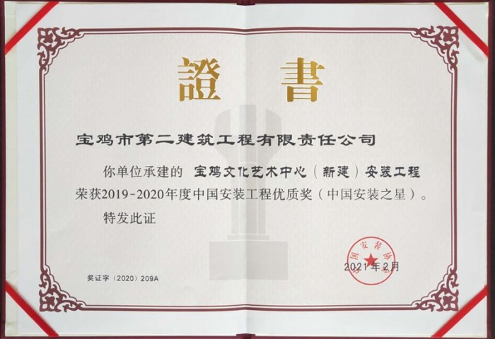 “中國安裝之星”是經(jīng)住建部批準設立的安裝類項目最高榮譽。旨在表彰安裝類施工項目質(zhì)量與觀感完美結合,設計創(chuàng)意與施工工藝達到先進水平的資源節(jié)約型和質(zhì)量觀感型的安裝精品工程。此次榮譽的取得,標志著寶雞二建安裝工程質(zhì)量邁上了新臺階。寶雞二建將不斷提高,在施工管理中積極推動新技術、新工藝、新材料的應用,全力抓好項目各項管理工作,精益求精,持續(xù)創(chuàng)建更多的精品工程。
